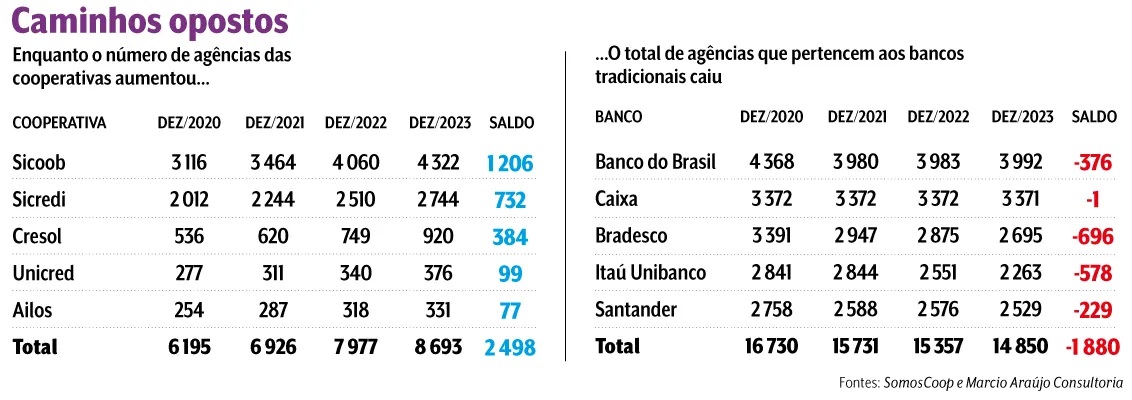 O sistema financeiro mudou. Ruas e avenidas que antes eram preenchidas por agências de grandes bancos aos poucos cedem espaço a outra modalidade de atendimento financeiro ao público — já conhecida, mas cada vez mais forte: o cooperativismo. O aumento da concorrência e do uso da tecnologia vem levando os bancos a fechar as portas das agências, enquanto as cooperativas vêm ocupando o espaço e disputando a clientela.