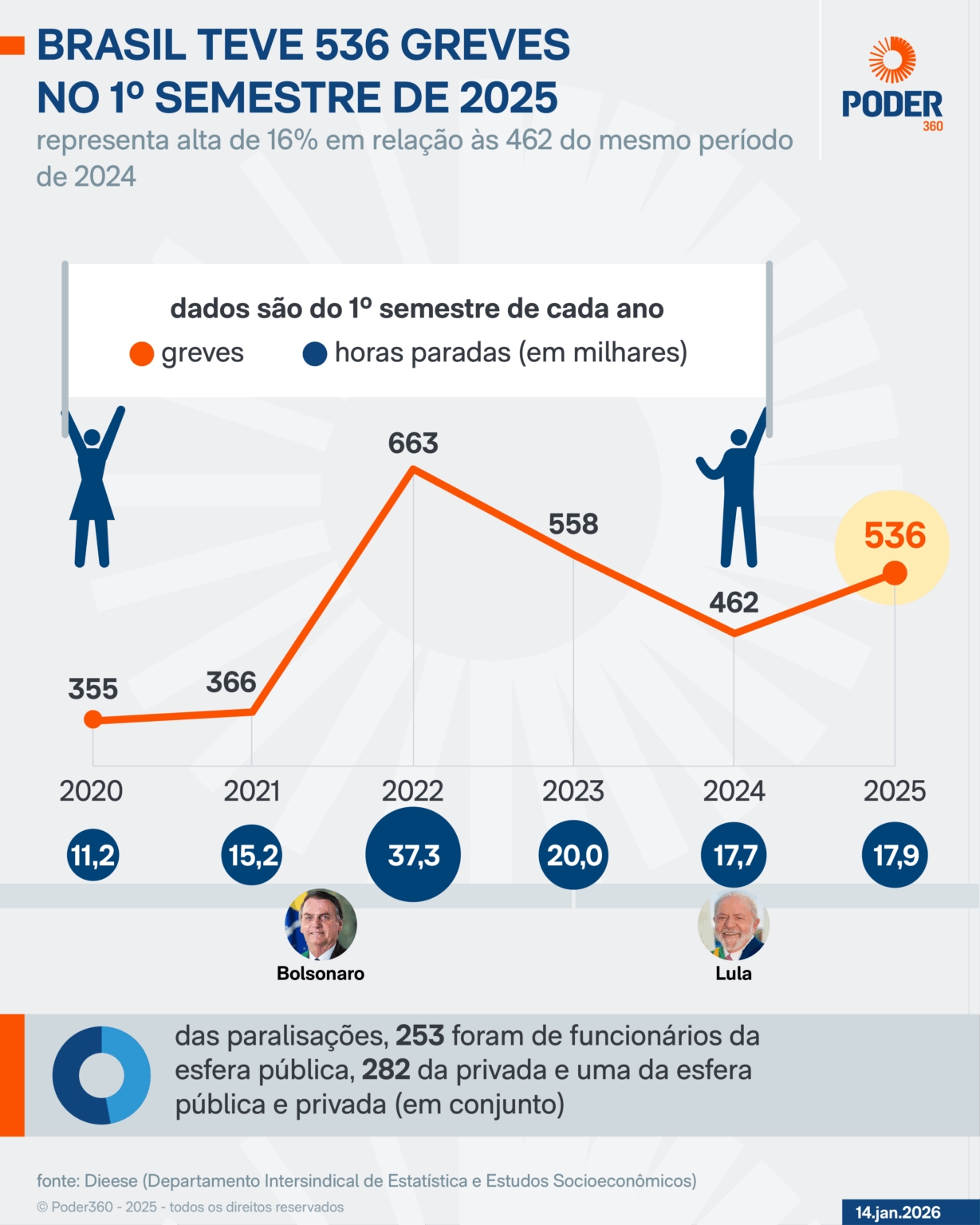 O Brasil registrou 536 greves no 1º semestre de 2025. O número representa alta de 16% em relação às 462 paralisações do mesmo período de 2024. O total de horas paradas nos 6 primeiros meses do ano passado foi de 17.877.