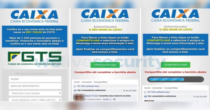 Para isso, é preciso que o usuário compartilhe a página com amigos antes de mostrar uma lista com nomes de beneficiários. Dessa forma, o cibercriminoso consegue disseminar com maior velocidade o seu golpe, atingindo um maior número de vítimas.