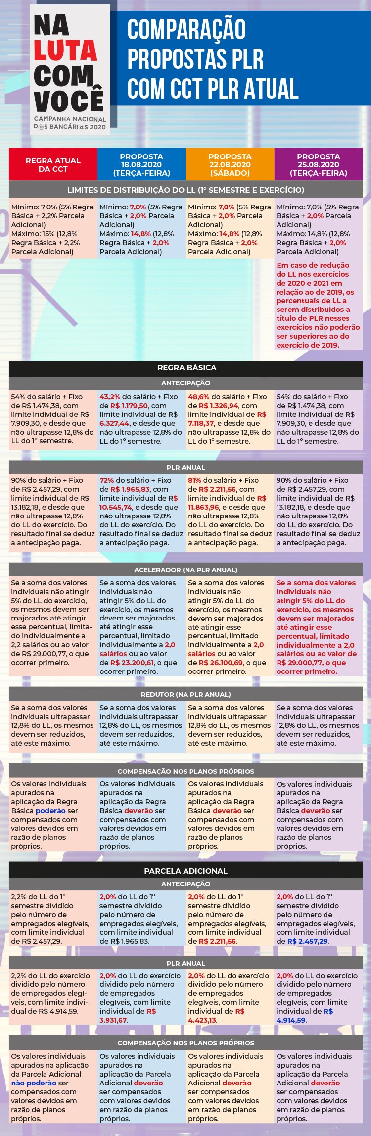 Na proposta de PLR feita terça-feira pelos bancos, apesar de terem retornado alguns valores fixos aos patamares atuais, os bancos mantiveram a redução do percentual da parcela adicional e a redução do acelerador da regra básica. Além disso, trouxeram uma questão nova que não havia surgido nas outras propostas: uma limitação do valor que os bancos poderão gastar com PLR ao mesmo percentual distribuído em 2019. Como em 2019, os lucros dos bancos bateram recordes, os percentuais deste lucro distribuídos foram pequenos.