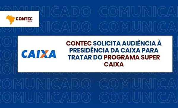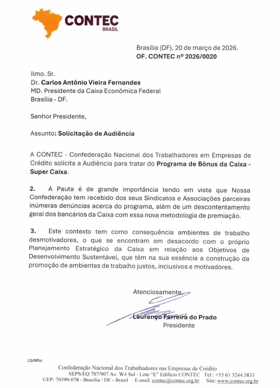 A Confederação Nacional dos Trabalhadores nas Empresas de Crédito (CONTEC) encaminhou, no dia 20 de março de 2026, ofício ao presidente da Caixa Econômica Federal, Carlos Antônio Vieira Fernandes, solicitando a realização de audiência para tratar do Programa de Bônus da Caixa – Super Caixa.