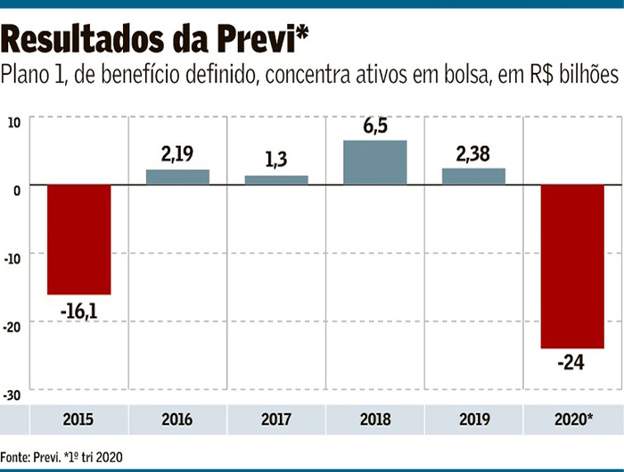 (Por Juliana Schincariol, Valor)A crise nos mercados causada pelo avanço do coronavírus levou a Previ, fundo de pensão dos funcionários do Banco do Brasil, a um déficit de R$ 24 bilhões no primeiro trimestre do ano. O resultado refere-se ao Plano 1, de benefício definido (BD), que concentra a maior parte dos investimentos em bolsa. Com o resultado positivo da bolsa em abril, houve recuperação de R$ 2 bilhões, segundo dado prévio.