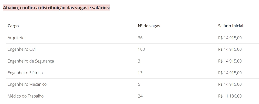 Para os cargos de Arquiteto e Engenheiro, a jornada diária é de 8 horas, totalizando 40 horas semanais. A remuneração mensal de R$ 14.915,00. No caso do médico, a jornada prevista é de 6 horas diárias, totalizando 30 horas semanais, com remuneração de R$ 11.186,00 mensais.