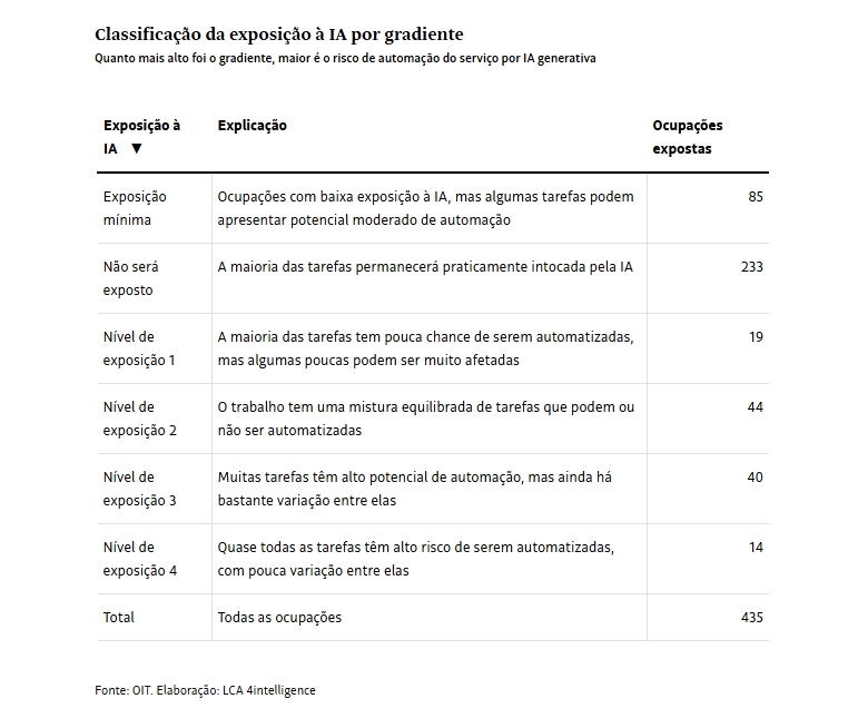 Foram consideradas 435 ocupações presentes no Brasil, classificadas de acordo com o nível de exposição definido pela OIT, e analisada a probabilidade de influência da IA dentro de cada ocupação. (Fonte: Folha de SP)
