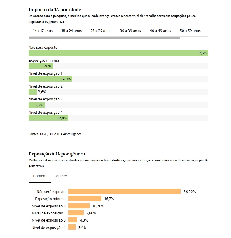 No relatório da OIT adaptado pela LCA para o Brasil, os jovens de 14 a 17 anos ocupam o terceiro grupo mais vulnerável a ser atingido pela IA generativa. Ao menos 12,8% dos trabalhadores nesta faixa etária estão no gradiente 4, refletindo a maior presença de jovens em funções administrativas e operacionais.