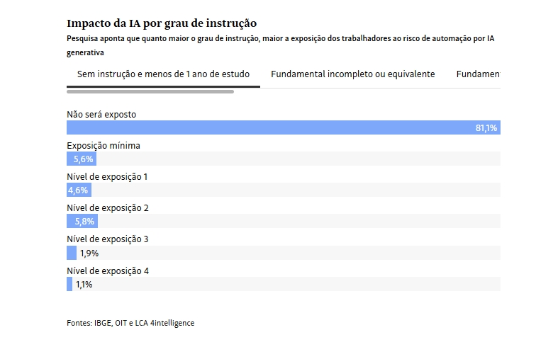 A IA generativa afeta ainda quem tem carteira assinada. Ao menos 13,2% desses profissionais no Brasil se encontram no cenário de maior exposição. O setor público, especialmente órgãos e secretarias, também deve ter alto impacto, pois possui alta concentração de funções administrativas e de processamento de informações.